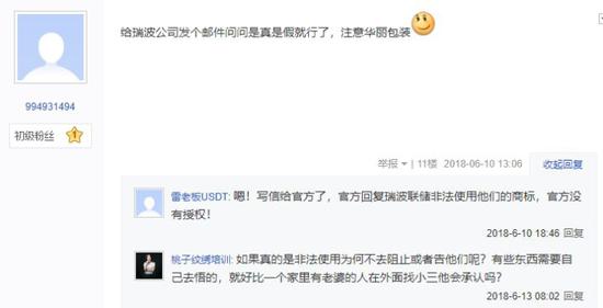 一些用户建议给瑞波公司发一封邮件,询问瑞波联邦储备银行和瑞波之间的关系。其他用户回答说,瑞波曾回答说,瑞波联邦储备银行非法使用了瑞波商标,但官方没有授权。一位“桃绣培训”的用户在附言中回答说,“如果这真的是违法的,为什么不停止或起诉他们呢?有些事情需要你自己去体会,就像一个家里有老婆的人在外面找情妇,他会承认吗?”