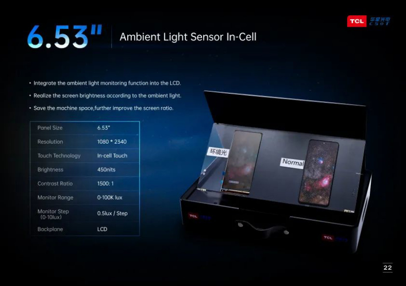 此外,TCL 华星还推出了全球首款环境光感应集成屏,搭载了 TCL 华星 LTPS 技术,在背板上集成了感光器件,实现外界环境光照度侦测时,显示屏可自动调整对应的亮度。
