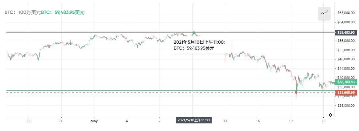 比特币自 4 月 14 日创下 64785.95 美元的历史高位之后不断波动,但自 5 月 10 日临近 60000 美元的高点之后就一路走低,目前市值 646.13 亿,现已跌去约 30000 美元。