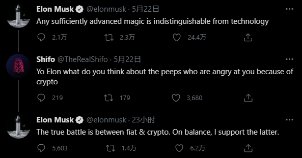 值得一提的是,马斯克昨日发文称:在法定货币与加密货币之间的战役中,他支持的是加密货币。引发全世界关注。