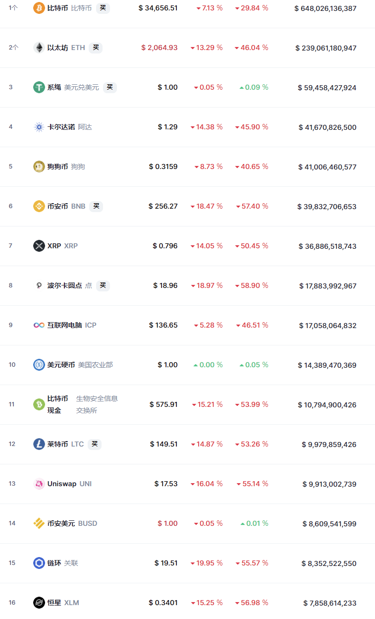 23 日消息 今日加密货币市场延续跌势,以太坊日内重挫 13%,失守 2000 美元 / 枚关口,刷新 5 月 19 日以来新低。此外,比特币现跌 7% 失守 35000 美元,莱特币跌约 15%,狗狗币近 10%。