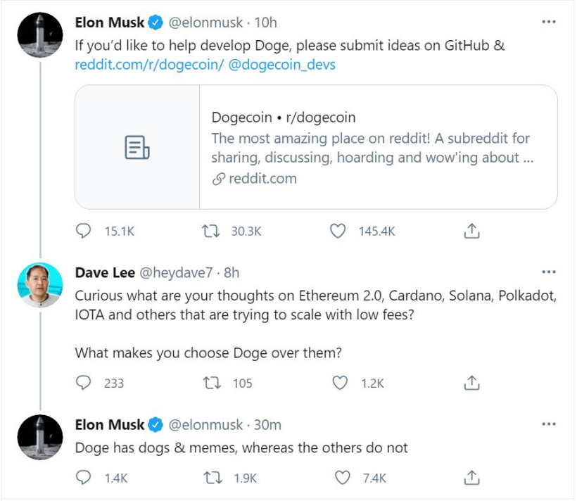 5 日消息 特斯拉 CEO 马斯克在推特回复网友提问时谈到选择狗狗币的理由。有网友问道,为什么不选择以太坊 2.0、Cardano、 Solana、Polkadot、 IOTA 或者其他加密货币?马斯克回答道,狗狗币有狗狗和 MEME 表情,而其他币没有。