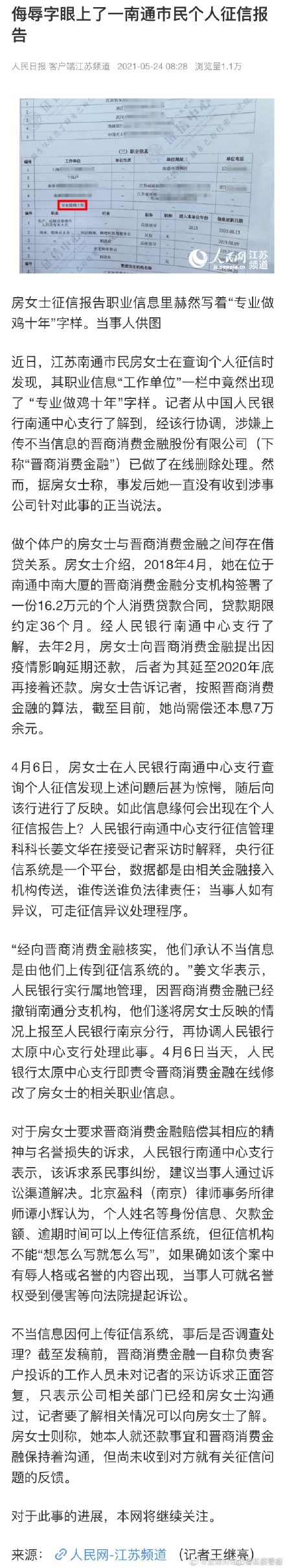 5月25日深夜,晋商消金发布声明,就房女士个人信用报告中的不当表述及对其所造成的影响致歉;同时,晋商消金表示欢迎消费者和广大媒体对该公司进行监督。晋商消金称,因该公司在采集房女士信用报告相关信息时,审核把关不严,给房女士带来诸多困扰,为此郑重致歉。此外,对于房女士的相关诉求,晋商消金表示一直与其保持积极沟通,并责成专人妥善解决。