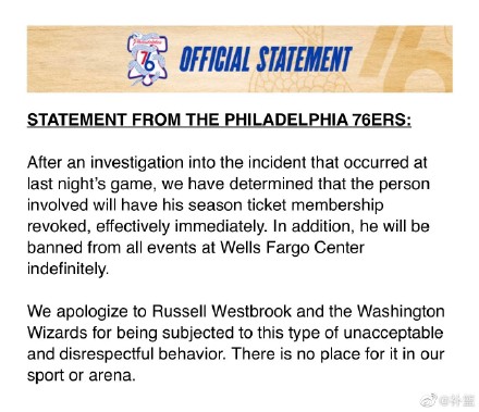 该名观众的行为是无法被接受的,球队在此对 @威斯布鲁克Russell_Westbrook 以及@华盛顿奇才 在比赛中遭受到的不尊重行为,致以诚挚的歉意。在我们的球队和球馆内,任何类似的行为都是无法容忍的。