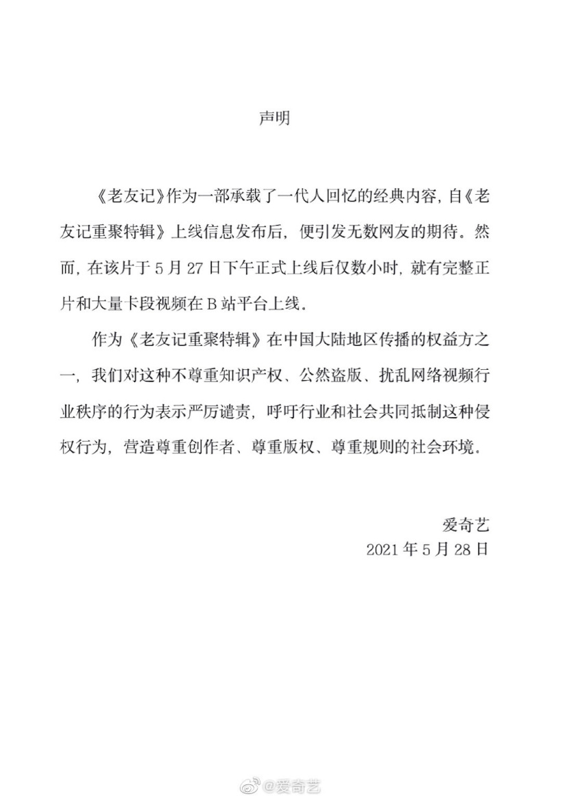 28 日 今日下午,爱奇艺、腾讯视频、优酷于同一时间(约 15:50)发布声明,表示《老友记重聚特辑》在上线发布后短短几个小时,就在哔哩哔哩(B 站)平台上出现大量侵权盗版视频,严重侵害了创作者以及版权方的正当权益。