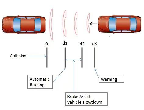 目前市场上已有的 BAS 与自动刹车系统,利用摄像头或雷达检测前方车辆,结合一定的行驶速度,分析出可能发生的碰撞时(如下图 d3 的距离),系统便警示驾驶员。