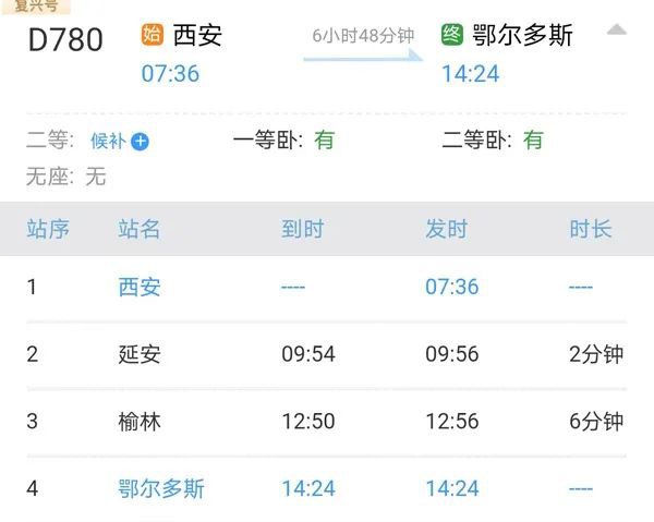 D780 次列车经陇海、包西铁路运行于下午 14 点 24 分到达鄂尔多斯站,预计运行 6 小时 48 分。
