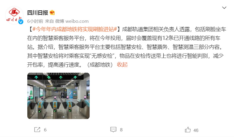 2 日消息 根据微博 @四川日报 消息,成都轨道集团相关负责人透露,成都地铁将进行一系列智慧改造,刷脸乘车等功能将在年内覆盖现有 12 条已开通线路的所有车站。