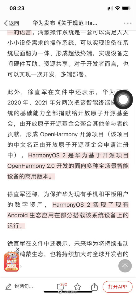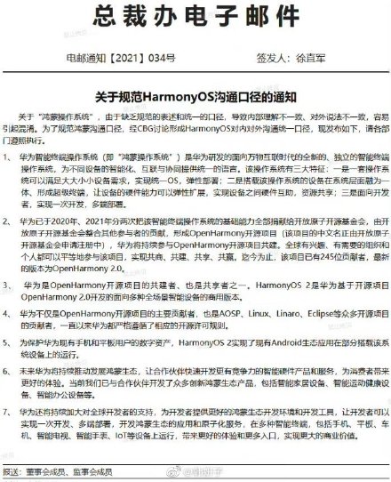 .统一口径】华为总裁办昨天发布了题为《关于规范HarmonyOS沟通口径的通知》的内部邮件,有轮值董事长徐直军签发,由华为最高层对鸿蒙OS进行统一定调。