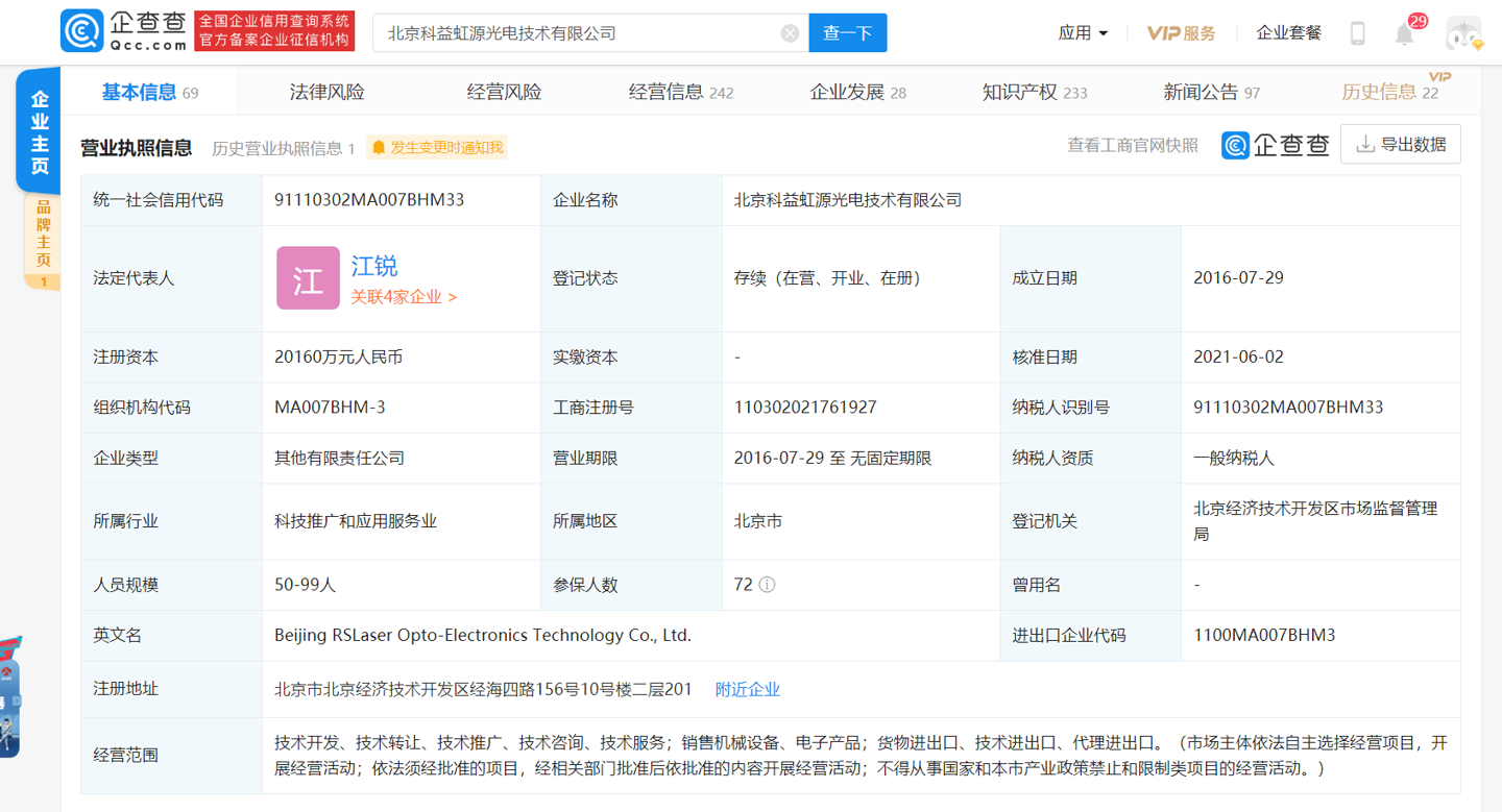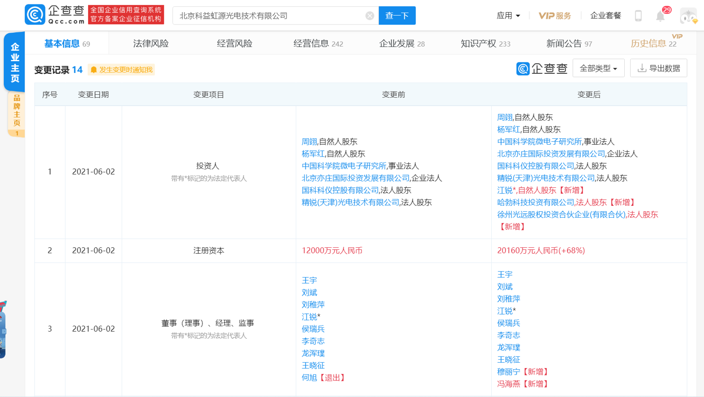根据企查查的资料显示,国内高端准分子激光技术厂商北京科益虹源光电技术有限公司(以下简称“科益虹源”)发生工商信息变更,新增新增股东华为关联公司哈勃科技投资有限公司等企业成为公司股东。