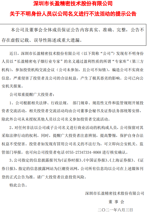 6 日消息 6 月 3 日晚,长盈精密发布公告称,公司发现有不明身份人员以“长盈精密电子烟行业专家”的名义通过盈利性质的所谓“专家库”(第三方机构),参加投资机构交流会议(公司未参加,且公司不知情),编造公司不实商业信息。
