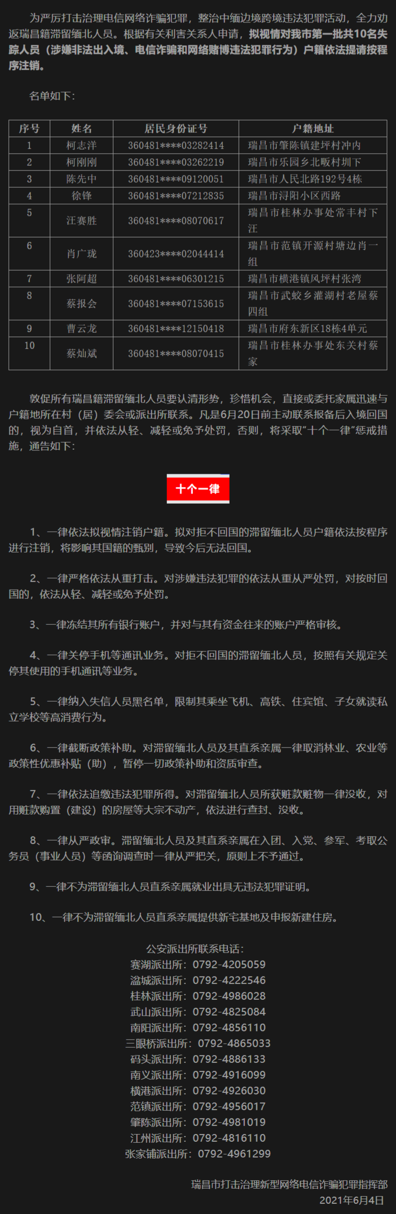 为严厉打击治理电信网络诈骗犯罪,整治中缅边境跨境违法犯罪活动,全力劝返瑞昌滞外人员,江西瑞昌市公安局 6 月 4 日下发了一份公告,宣布将依法拟视情注销失踪者户籍。