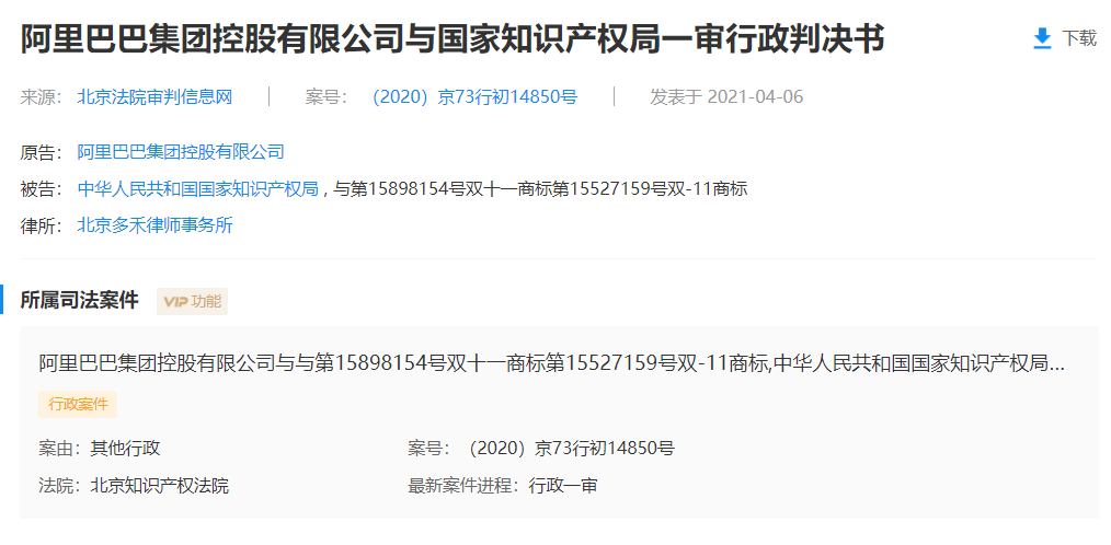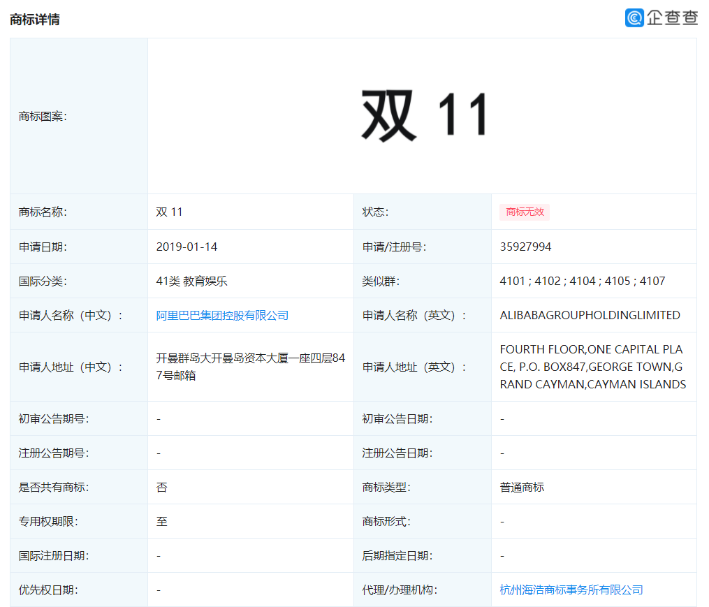 7 日消息 企查查 App 显示,阿里巴巴此前申请的“双 11”商标(国际分类 41 类 教育娱乐),于近日的终审判决中被驳回。