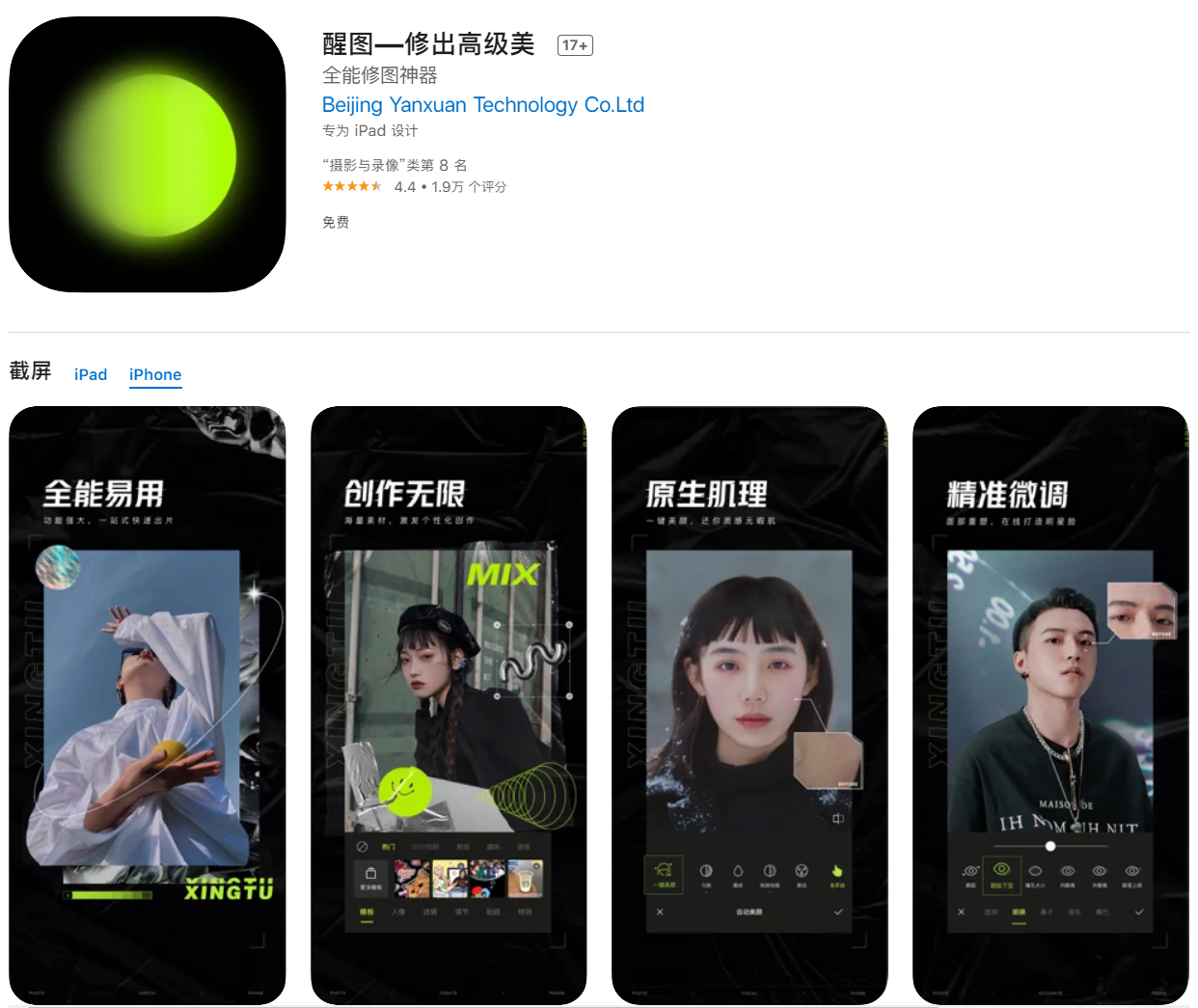 字节跳动在去年也推出了一款类似的产品,名为“醒图”,定位是一款操作简单、功能强大的全能修图 App,主要面向女性用户,宣称可一键操作,拥有高级质感肤质。