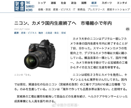 【一年亏20亿元!突然,相机巨头宣布:结束日本生产!】#尼康将于年内停止日本国内相机生产# 据日本共同社报道,日本相机巨头尼康将于年内结束数码单反相机机身的国内生产。作为结构性改革的一环,尼康将把日本国内唯一一家生产相机机身的宫城县工厂的生产转移至泰国主力工厂。
