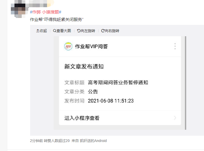 今天中午,有网友表示作业帮于中午 11:51 发布公告,表示在高考期间问答业务暂停。凤凰网科技对作业帮 App 和小猿搜题 App 进行测试发现,二者拍照搜题功能可正常使用,但作业帮客服表示在 6 月 7 日(周一)8:00-6 月 10 日(周四)18:00 暂停所有问答服务,且无法看到 6 月 7 号 - 6 月 10 号的提问记录。