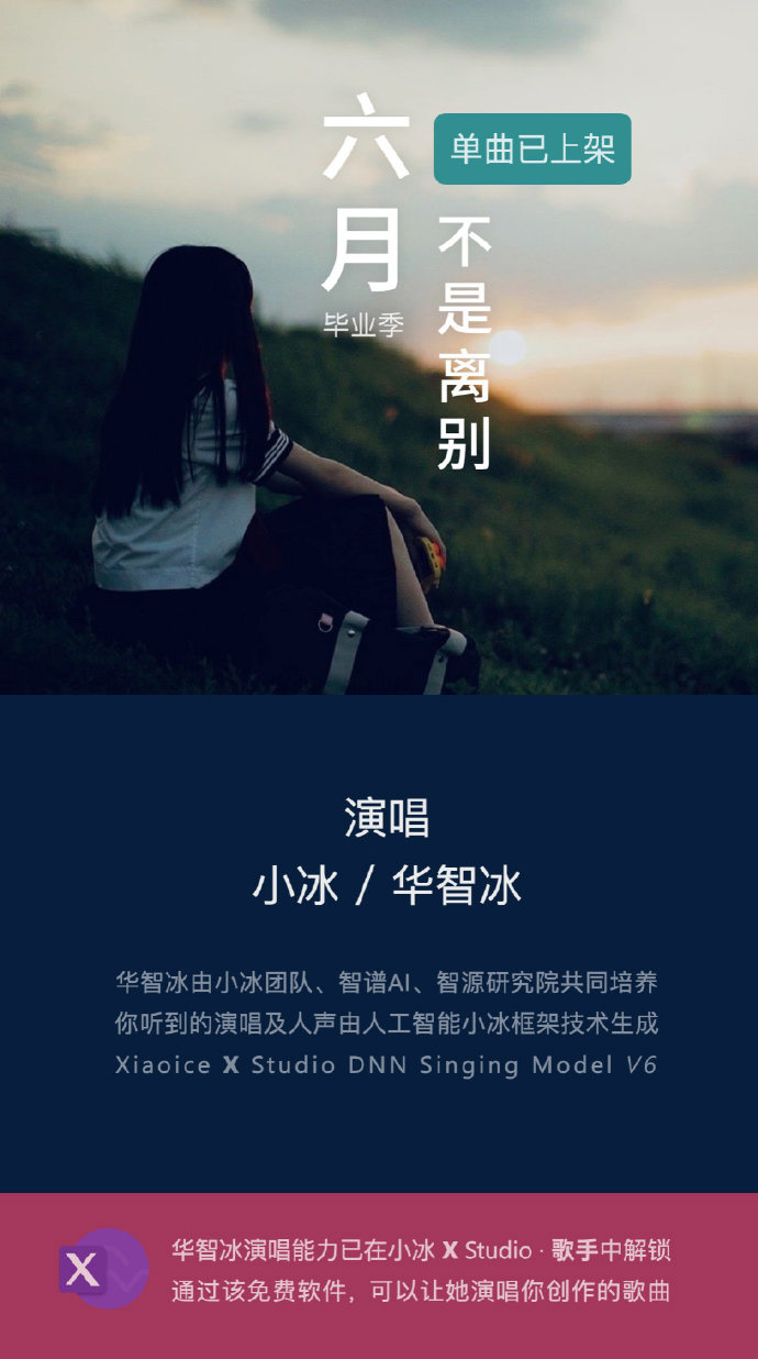 X Studio?歌手新版本不仅限于优化人工智能少女小冰的声音,还支持对框架内任意人工智能歌手的声线进行演绎。日前入学清华的中国首个原创虚拟学生华智冰,也已正式入籍并解锁演唱能力,广大用户可免费下载并体验。作为技术示例,人工智能少女小冰与华智冰共同演绎的毕业季单曲《六月,不是离别》,也于今天同时上线。