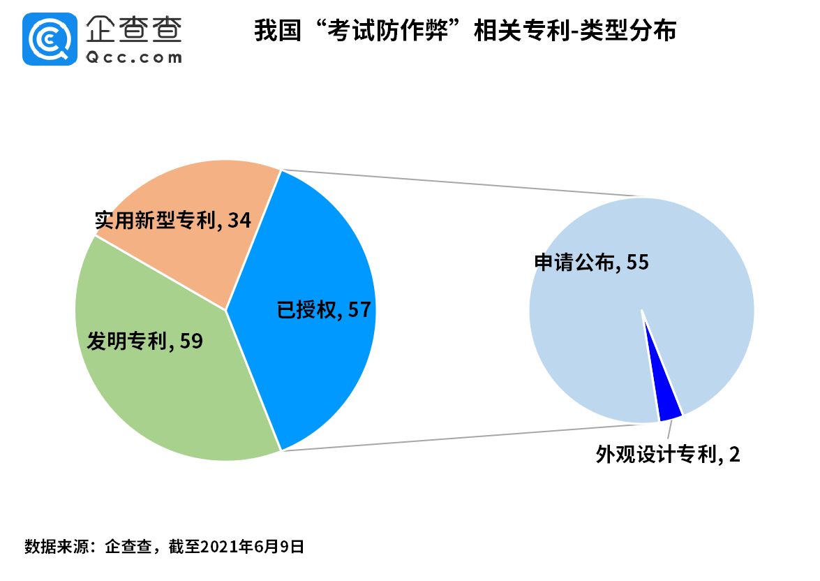 企查查数据显示,截至目前(6 月 9 日)我国共有 95 项考试防作弊专利,从专利类型来看,发明专利数量最多,共 59 项;其次是实用新型专利,共有 34 项,最少的是外观设计专利,仅有 2 项。包含“考试防作弊课桌”、“英语考试防作弊屏蔽器”、“网络课程学习与考试防作弊监控系统”等。
