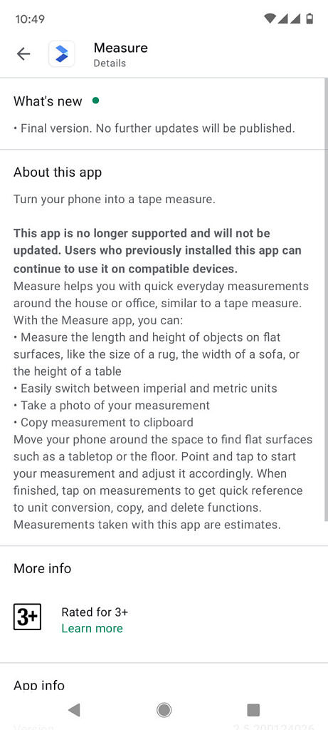 10 日消息 谷歌近日在 Google Play 下架了官方 AR 测量 App Measure,该 App 可使用手机摄像头对现实中的物体测量长度。