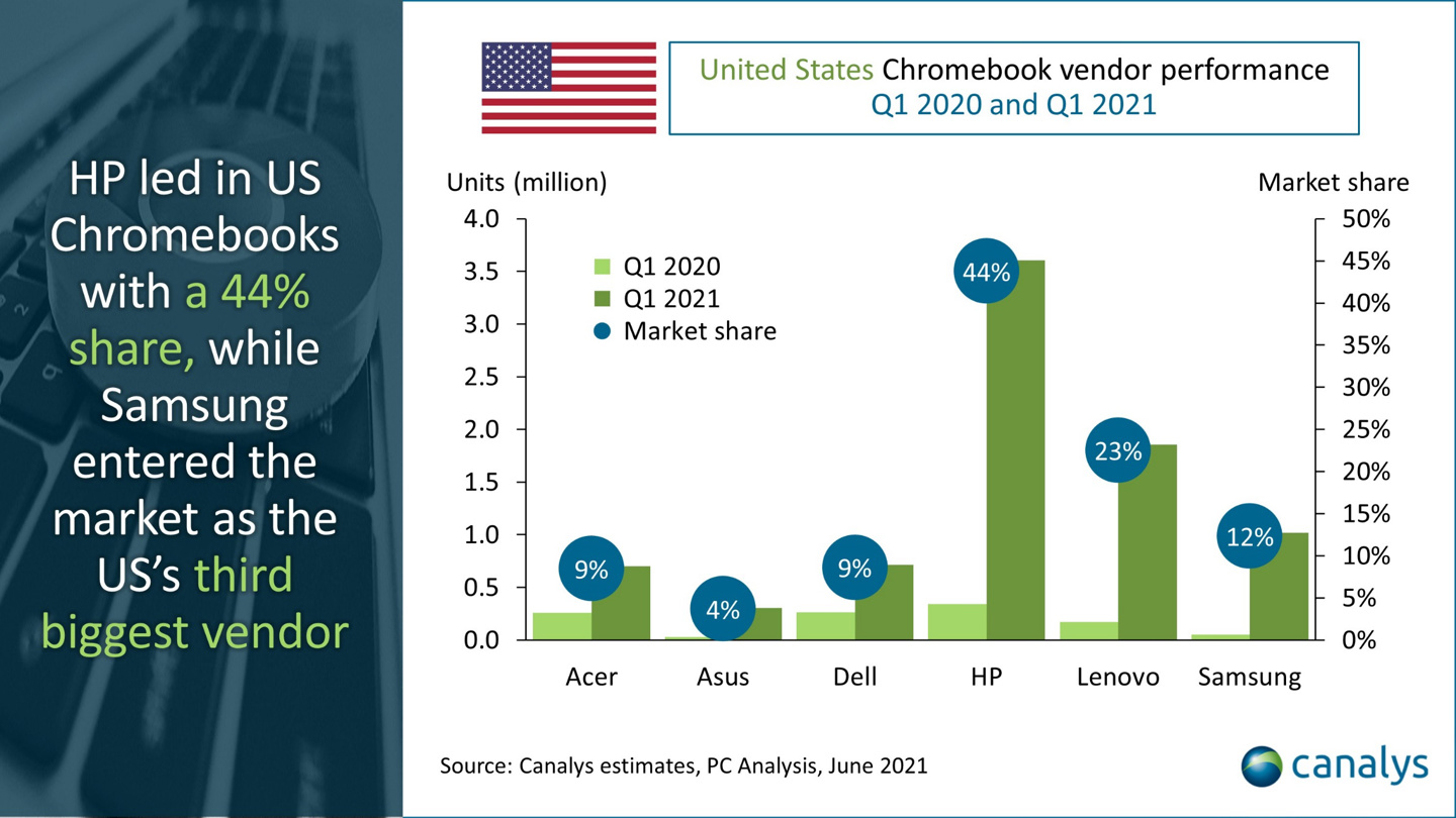 研究报告表示,惠普出货量的大幅增长,得益于其 Chromebook 的热销。苹果 MacBook 以及 iPad 的销量表现稳定,联想、三星同样受益于 Chromebook 的大量出货,这一类笔记本电脑在教育和商用领域十分受美国消费者欢迎,是第一季度增速最高的产品类别。