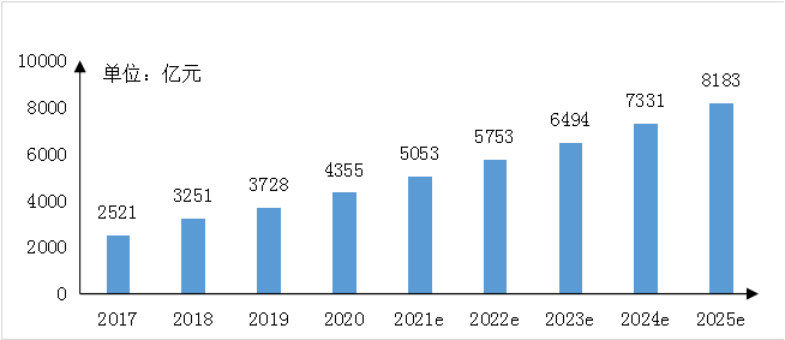 中国智能家居市场规模以千亿元计,且仍将保持 10% 以上的增速。预计 2025 年智能家居市场规模将突破 8000 亿元,如图 1 所示。从市场结构看,当前家电原始市场仍然是绝对主力,市场规模近 3000 亿元,智能连接控制、智能家庭安防、智能家庭娱乐以及智能感光位列其后。