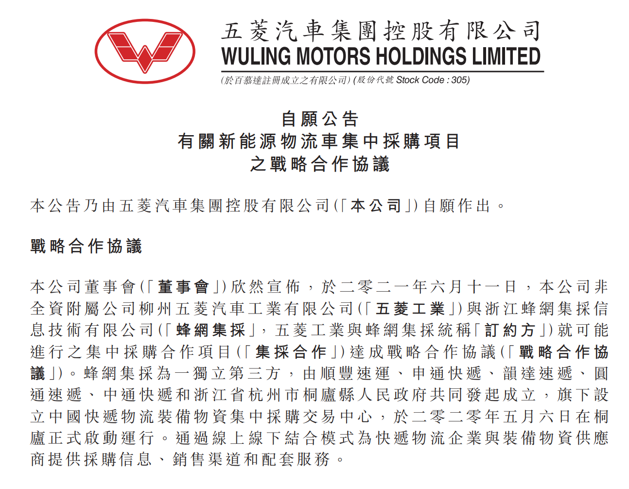 与此同时,在集采合作事项下,五菱工业将定制生产包括且不限于新能源配送车和冷链车等满足快递配送需求且符合国家法规和汽车质量标准要求的车型,给予蜂网集采的销售价格为国内优惠价格,并提供不低于市场普遍标准的售后服务,为客户提供专项的服务保障;五菱工业所有在集采中心平台上的销售均为在线交易。