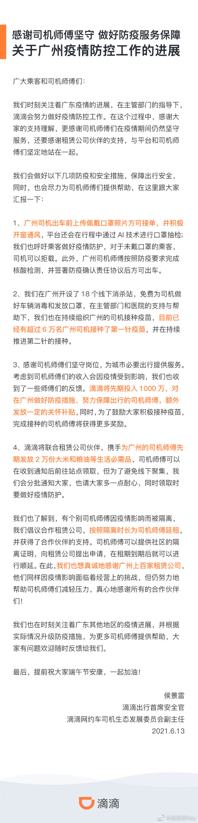 以下为滴滴出行《关于广州疫情防控工作的进展》全文: