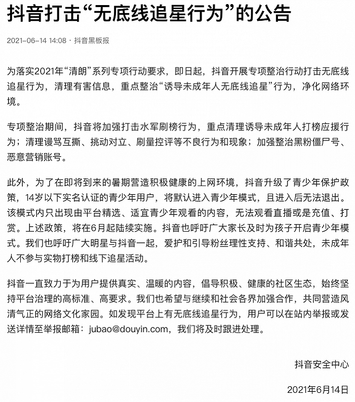 14 日消息 抖音在其官方头条号发布公告称,为落实 2021 年“清朗”系列专项行动要求,即日起,抖音开展专项整治行动打击无底线追星行为,清理有害信息,重点整治“诱导未成年人无底线追星”行为,净化网络环境。专项整治期间,抖音将加强打击水军刷榜行为,重点清理诱导未成年人打榜应援行为;清理谩骂互撕、挑动对立、刷量控评等不良行为和现象;加强整治黑粉僵尸号、恶意营销账号。