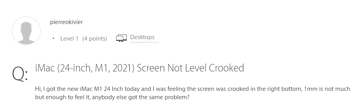 此外,苹果支持社区和 Reddit 也有用户反馈,自己的 M1 iMac 电脑是歪的,两侧高度差在一至几毫米。