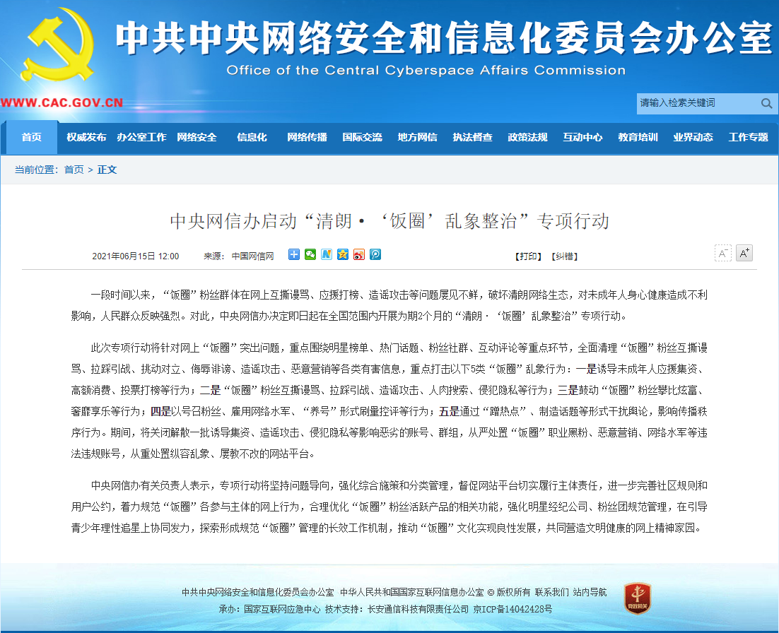 据称,此次专项行动期间,将关闭解散一批诱导集资、造谣攻击、侵犯隐私等影响恶劣的账号、群组,从严处置“饭圈”职业黑粉、恶意营销、网络水军等违法违规账号,从重处置纵容乱象、屡教不改的网站平台。