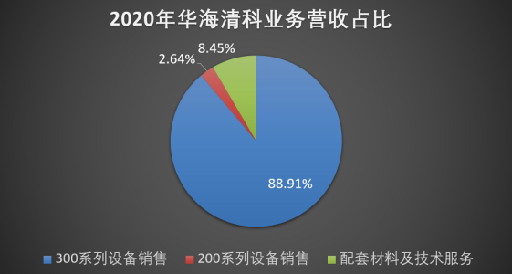 根据统计,300 系列设备是华海清科的主营产品,2020 年 300 系列设备销售金额占总营收比例分别为 88.91%,200 系列占比为 2.64%,配套材料及技术服务占比则为 8.45%;2018 年-2020 年,300 系列设备的销售金额占华海清科营收占比分别为 89.01%、92.39% 和 88.91%。