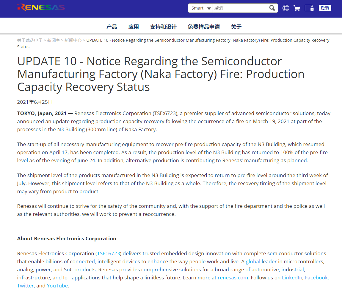 该公司称,N3 大楼产品的出货量预计将在 7 月第三周左右恢复到火灾前的水平,但是具体的芯片出货情况因产品而异。此外,瑞萨电子将继续为生产安全努力,在消防部门和警方等相部门的合作下,该公司将努力防止火灾等事故再次发生。