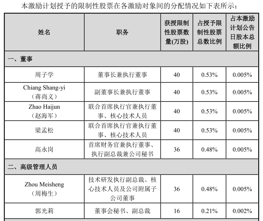 根据中芯国际公告,本次激励计划拟授予的限制性股票总量不超过 7565.04 万股,激励对象不超过 4000 人,约占公司 2020 年底员工总人数的 23.05%。除了梁孟松以外,还授予中芯国际董事长周子学、副董事长兼执行董事蒋尚义、联合首席执行官兼执行董事/核心技术人员赵海军每人 40 万股限制性股票,此外授予首席财务官兼执行董事高永刚 36 万股;技术研发副总裁、核心技术人员周梅生以及董事会秘书、副总裁分别获得了 36 万股和 16 万股。