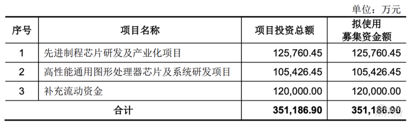 本次发行股票数量不超过 4100 万股,占发行后总股本的比例不低于 10%,拟募资 35.12 亿元,投入先进制程芯片研发及产业化、高性能通用图形处理器(GPU)芯片及系统研发和补充流动资金。