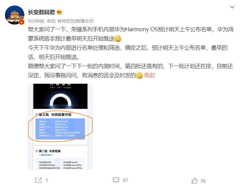 此外,@长安数码君 透露,华为 HarmonyOS 第四批内测时间还没有确定,大家还请耐心等待。