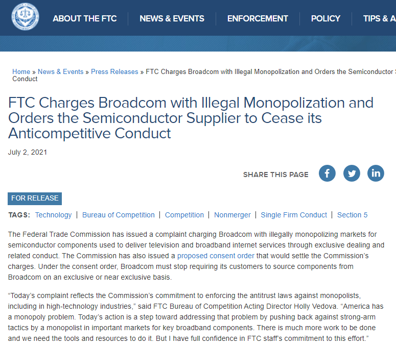FTC 在诉状中指出,博通利用独家交易非法垄断了传输电视和宽带互联网的计算机芯片组件 (即半导体) 市场。