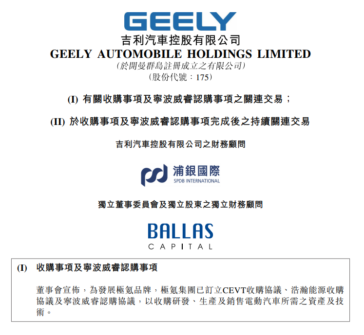 公告指出,在收购事项及宁波威睿认购事项完成后,极氪集团将拥有由 CEVT 开发的汽车及电动汽车相关技术,并从事生产及销售电动汽车、动力电池和电驱系统及其他汽车部件。