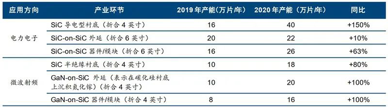 微波射频方面,SiC 半绝缘衬底折算 4 英寸产能约为 18 万片/年。2020 年,新能源汽车、快充、5G 等下游应用市场增长超预期,国内现有产品商业化供给无法满足市场需求,SiC 电力电子和射频存在较大缺口。