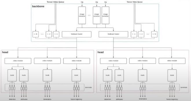 深度学习模型使用卷积神经网络从安装在汽车周围的 8 个摄像头的视频中提取特征,并使用变换神经网络将它们融合在一起。然后,它会随着时间的推移融合这些信息,这对于轨迹预测和消除推理不一致等任务来说非常重要。然后,空间和时间特征被输入神经网络的分层结构中,卡帕西将其描述为头部、躯干和神经。他说:“你之所以想要这种分层结构,是因为你对大量的输出感兴趣,但你负担不起每个输出都有对应神经网络的代价。”