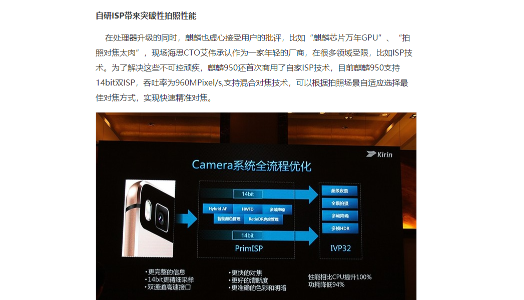 在讨论这个问题之前,我们必须明白一点,那就是自研 ISP 芯片在手机行业其实并不罕见。在 OPPO 之前,小米、华为、苹果和三星都已经推出了自研 ISP 芯片。以华为为例,华为从麒麟 950 处理器就开始集成了自研的 ISP 芯片,可以自己从底层深度优化照片的处理,华为也借此跻身全球手机拍照的第一阵营。