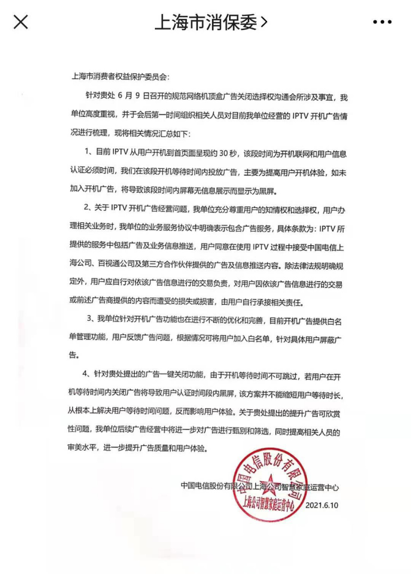 据第一财报道,7 月 5 日晚间,针对上海市消保委发布的有关 IPTV 开机广告内容,中国电信上海公司回复称,关注到上海市消保委发布的相关内容后,高度重视,连夜成立专项工作组,研究 IPTV 开机广告一键关停技术方案并将尽快落实。
