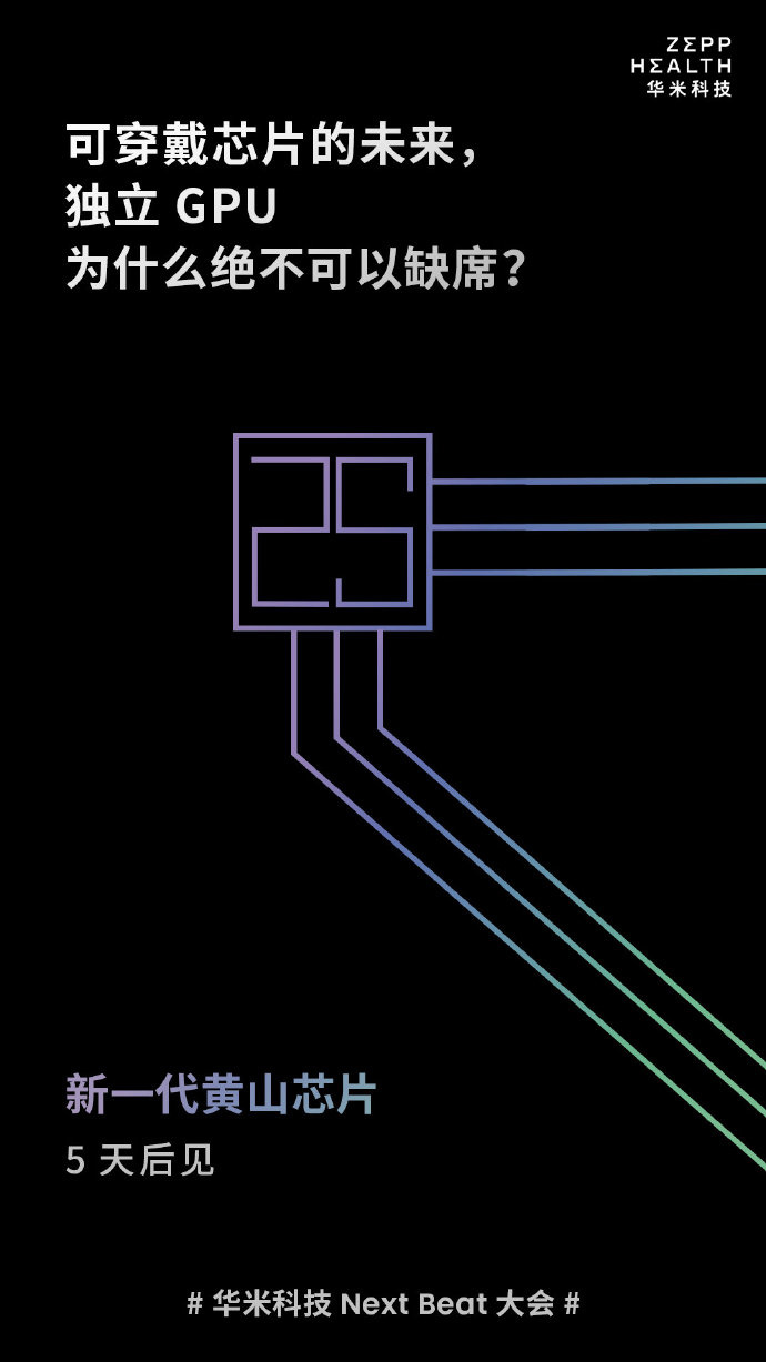 今天,华米科技在官方微博放出消息称,将在 5 天后带来新一代黄山芯片。文案写道:“可穿戴芯片的未来,独立 GPU 为什么绝不可以缺席?新一代黄山芯片,5 天后见。”