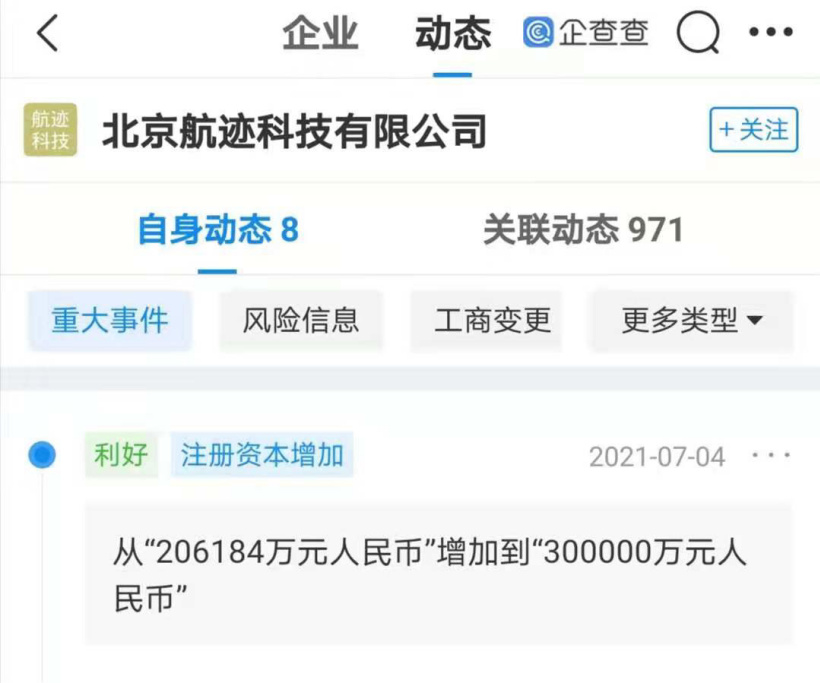 8 日消息 近日,北京航迹科技有限公司发生工商变更,公司注册资本由约 20.62 亿元人民币增加至 30 亿元人民币,增幅约 45.49%。