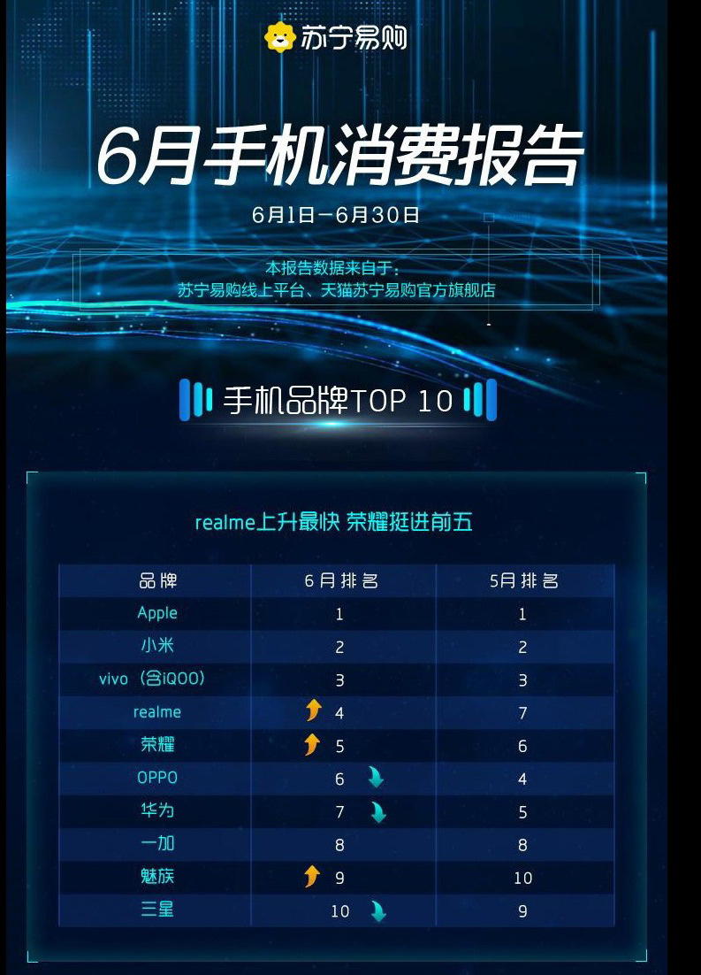 与此同时,魅族品牌影响力也得到增长,相比 5 月排名,在苏宁手机品牌 Top 10 榜单上再进一步。