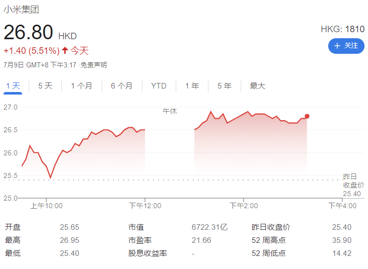 此次爆料未提及交易金额,但业界认为该公司估值至少可以 10 亿元人民币来看待。截止发稿,双方尚未回应,不过小米港股午后开盘股价一路走高,最新涨幅 5.51%,暂报 26.80 港元,市值 6722.31 亿港元。