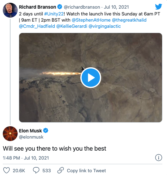 马斯克在 Twitter 上回复布兰森的发射倒计时两天的推文时称:“会在那里祝你一切顺利。”