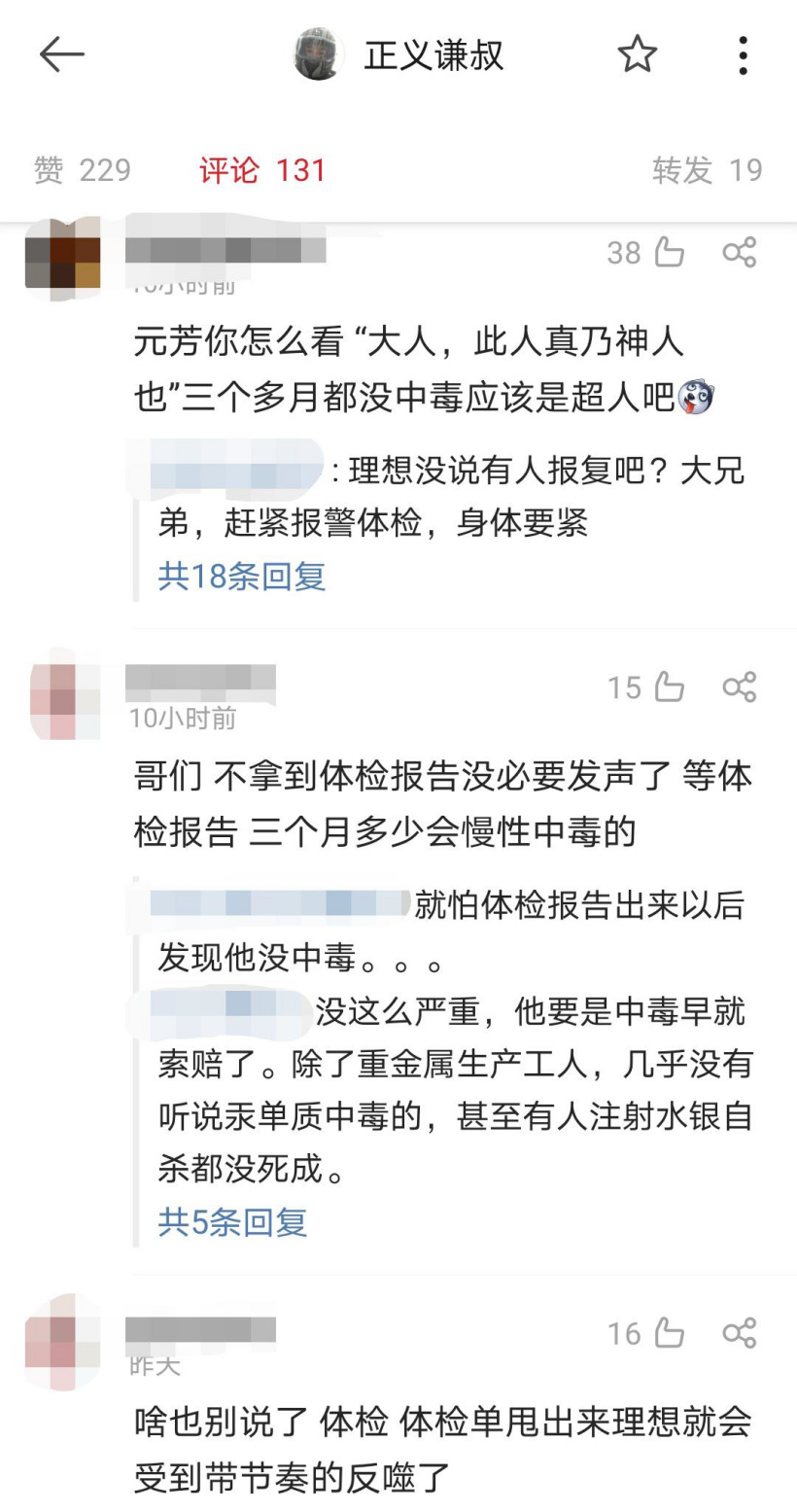 对此,网友表示质疑,认为车主应该拿出体检单证明。“三个多月都没中毒应该是超人吧”“不拿到体检报告没必要发声了 等体检报告 三个月多少会慢性中毒的”“啥也别说了 体检 体检单甩出来理想就会受到带节奏的反噬了”。