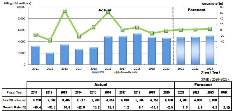 尽管市场上对相对较成熟的第 6 代 OLED 产线和第 10.5 代 LCD 产线的资本投资将在 2021 年放缓,但是日本半导体制造设备协会在以 2020 年为基准对市场环境进行审查后,认为平板显示器制造设备将与往年保持在同一水平或略有增长。