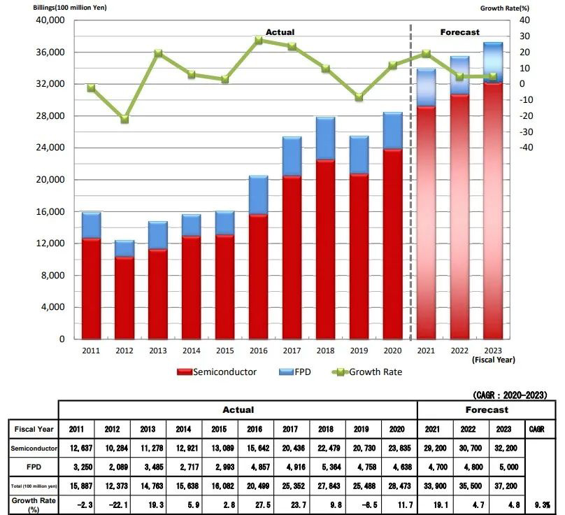 在这份报告中,日本半导体制造设备协会对日本制造的半导体及平板显示器制造设备销售情况也做了整体上的预测。预计 2021 年整体销售额将达到 3.39 万亿日元(约合人民币 1992 亿元),增长 19.1%;2022 年,半导体将继续保持 5.1%的增长,平板显示器的增长幅度则较小,但整体销售额也将达到 3.55 万亿日元(约合人民币 2086 亿元),增长 4.7%;2023 年预计销售额为 3.72 万亿日元(约合人民币 2186 亿元),增长 4.8%。