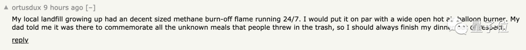 有人就提到在他们当地,也有一个垃圾填埋场会常年燃着一个由甲烷供给的火把,这是为了警示人们要更加环保。